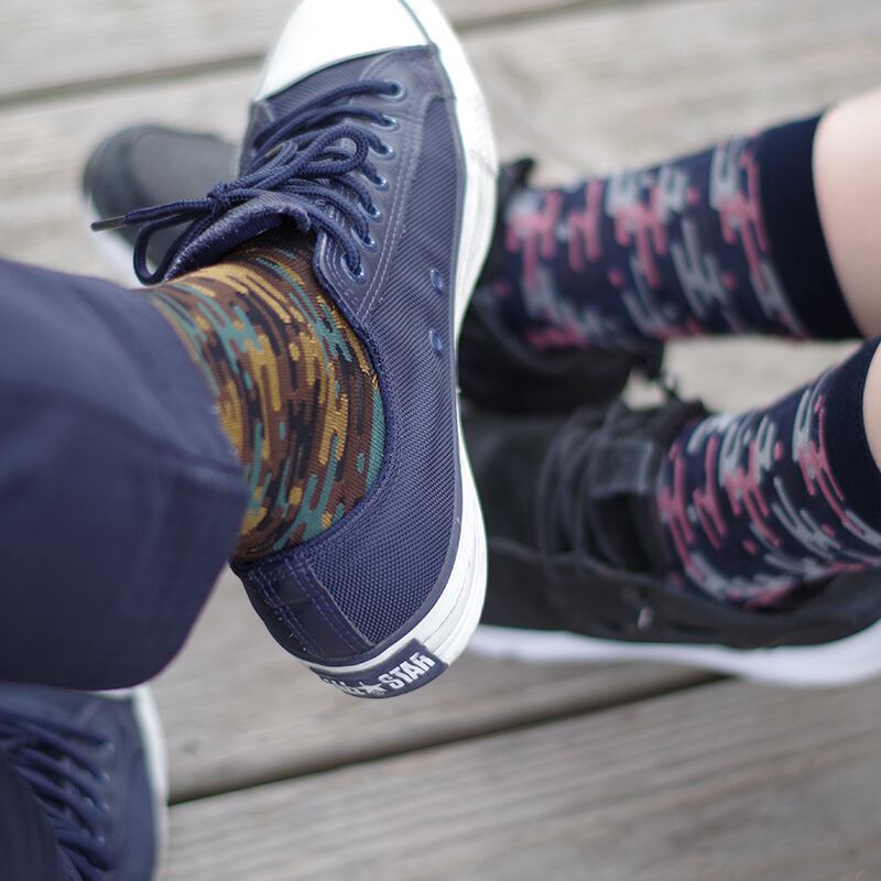 和柄をカラフルポップにアレンジした「紬POP」シリーズの靴下。大島紬のようなシャリっとした手触りにこだわり、摩周湖という高級綿を使用しています。履き心地が良く、絹のようなツヤ感とサラっとした肌触りが特徴です。